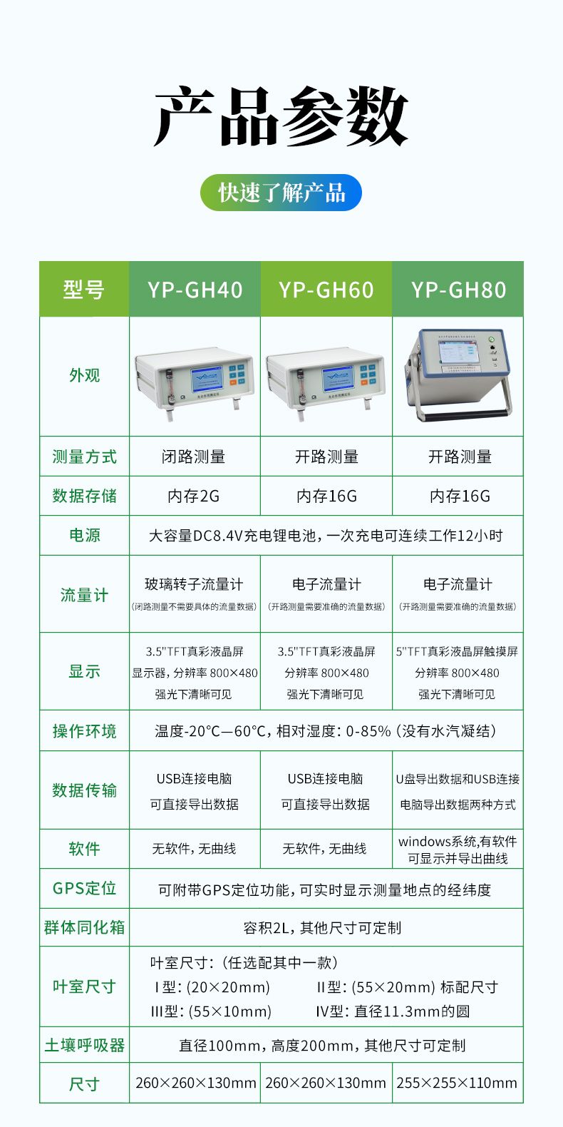 YP-GH60光合作用測定儀是通過測量植物葉片一定時間內CO2吸收(釋放)的量, 并同時測量空氣溫濕度,葉片溫度,光照強度以及同化CO2的葉片面積等要素,就可以直接計算出植物的光合速率、蒸騰速率、細胞間CO2濃度和氣孔導度等光合作用指標。該儀器具有靈敏度高、反應迅速,抗干擾性強,操作方便,可以進行活體的、連續的測定等突出優點,因而被廣泛應用于植物生理學、植物生物化學、生態環境、農業科學等多個領域。