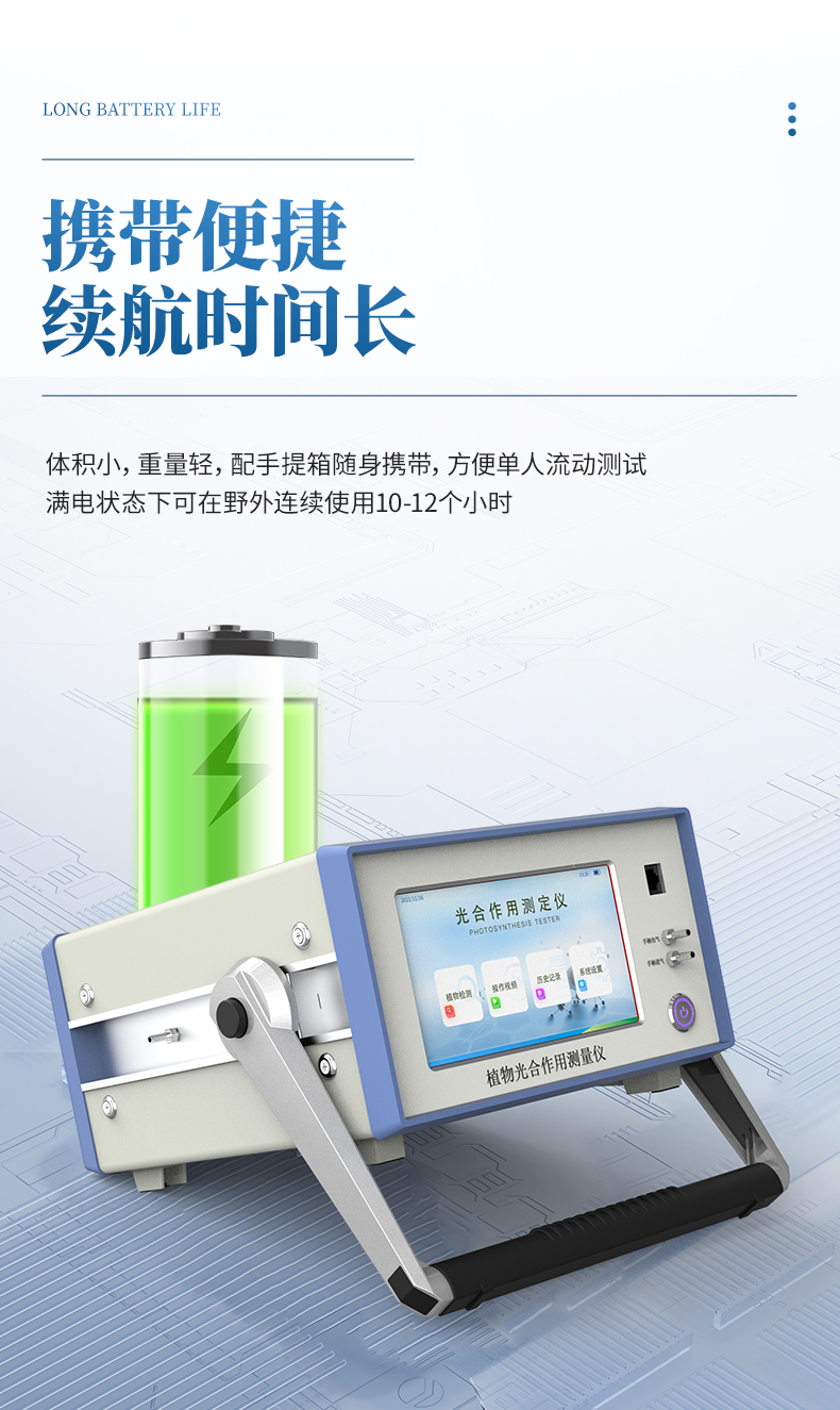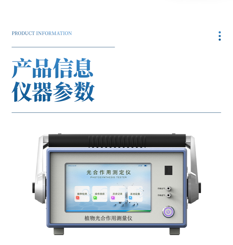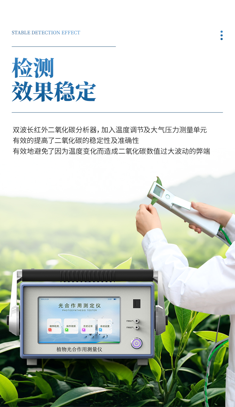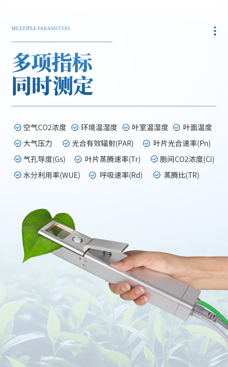 GH1植物光合作用測定儀是一款檢測人工氣候室、溫室、大棚、大田等植物的活體葉片光合作用的實驗儀器,測定內容包括空氣CO2濃度、環境溫濕度、葉室溫濕度、葉面溫度、大氣壓力、光合有效輻射(PAR)、葉片光合速率(Pn)、氣孔導度(Gs)、葉片蒸騰速率(Tr)、胞間CO2濃度(Ci)、水分利用率(WUE)、呼吸速率(Rd)、蒸騰比(TR)共15項參數,可用于植物生長生理、光合生理、脅迫生理研究等科學研究,植物光合作用測定儀適用于農業科研、教學、園藝、草業、林業以及更廣泛的領域。