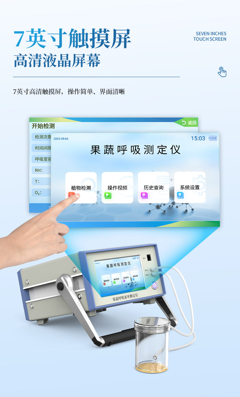 果蔬呼吸儀采用雙波長紅外二氧化碳分析器,7寸安卓顯示器,專門用于常溫、冷藏庫、氣調庫、超市冷柜等儲藏條件下的果品和蔬菜呼吸強度的測定和分析研究。