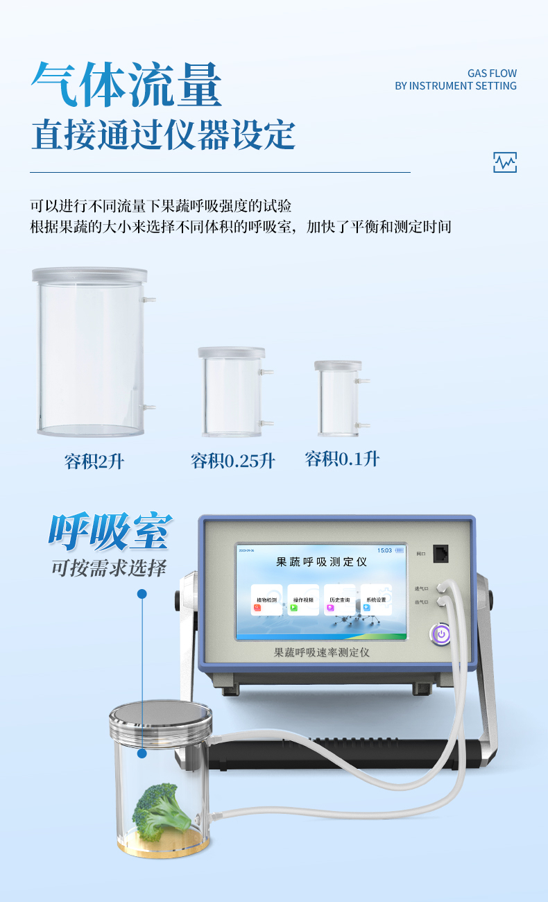 3、氣體流量直接通過儀器設定,可以進行不同流量下果蔬呼吸強度的試驗;