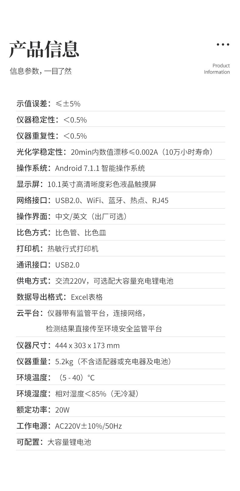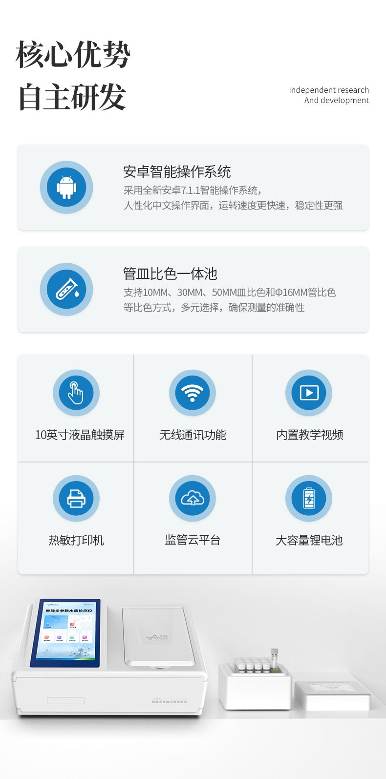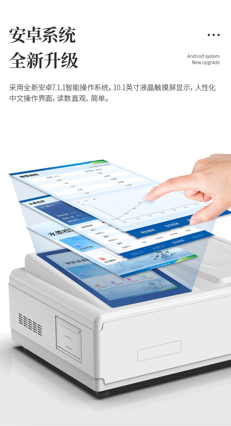 【產品簡介】檢測水質重金屬含量指標,兼具智能數據分析功能,高清晰度彩色液晶觸摸顯示屏,Android智能操作系統
