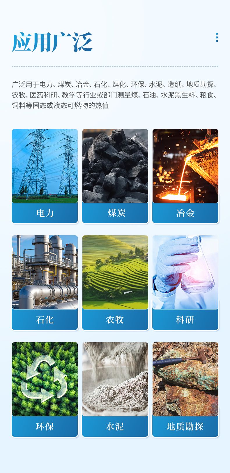 適用于生產(chǎn)、研究和使用可燃物質(zhì)的企業(yè)、大專院校、科研部門及軍工單位用來測定 煤炭、焦炭、化工、糧食、木材、飼料等可燃物質(zhì)的發(fā)熱量和火藥的爆熱值。