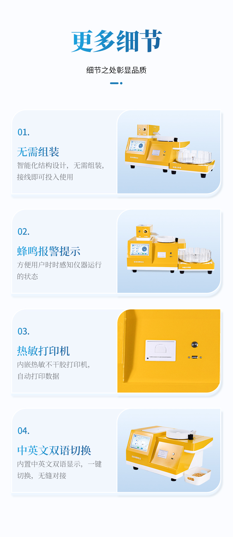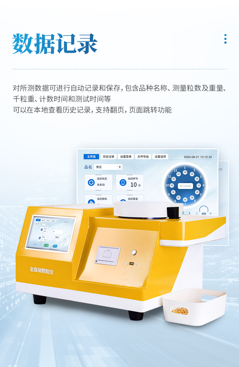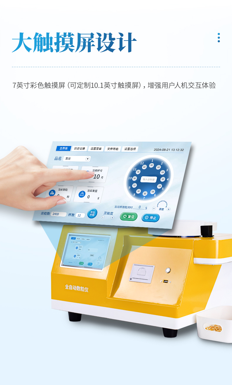 3、智能化程序設定:分樣型自動數粒儀以數粒為核心,功能覆蓋全面,程序設定后,從料倉到轉盤全自動大批量分樣數粒,減少人工時間。