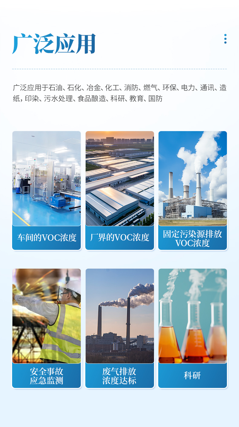手持式VOC檢測儀主要用于檢測車間的VOC濃度、廠界的VOC濃度、固定污染源排放VOC濃度、安全事故應急監測、廢氣排放濃度達標快速檢測。