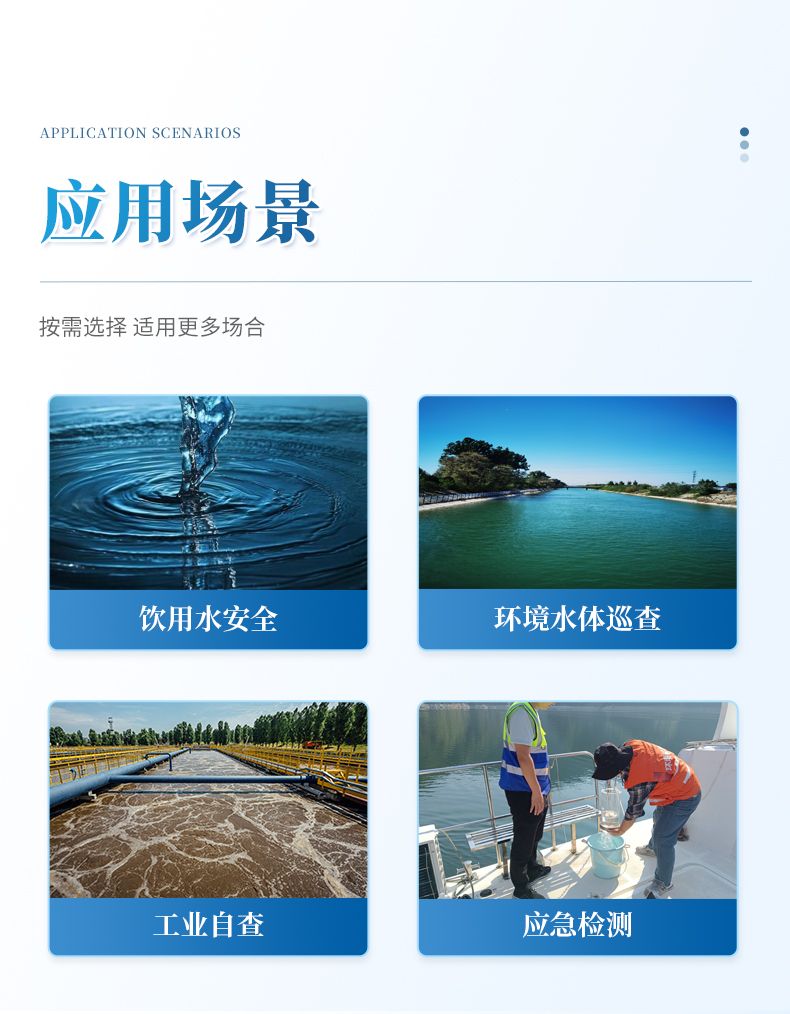 儀器將復(fù)雜的實驗室分析流程集成于手持機身中,操作簡捷,可在現(xiàn)場數(shù)分鐘內(nèi)獲得可靠結(jié)果。其性能符合國家標(biāo)準(zhǔn)方法要求,適用于飲用水安全篩查、環(huán)境水體巡查、工業(yè)廢水排放監(jiān)控及應(yīng)急檢測等多種場景,是保障用水安全、實現(xiàn)高效現(xiàn)場管控的得力工具。