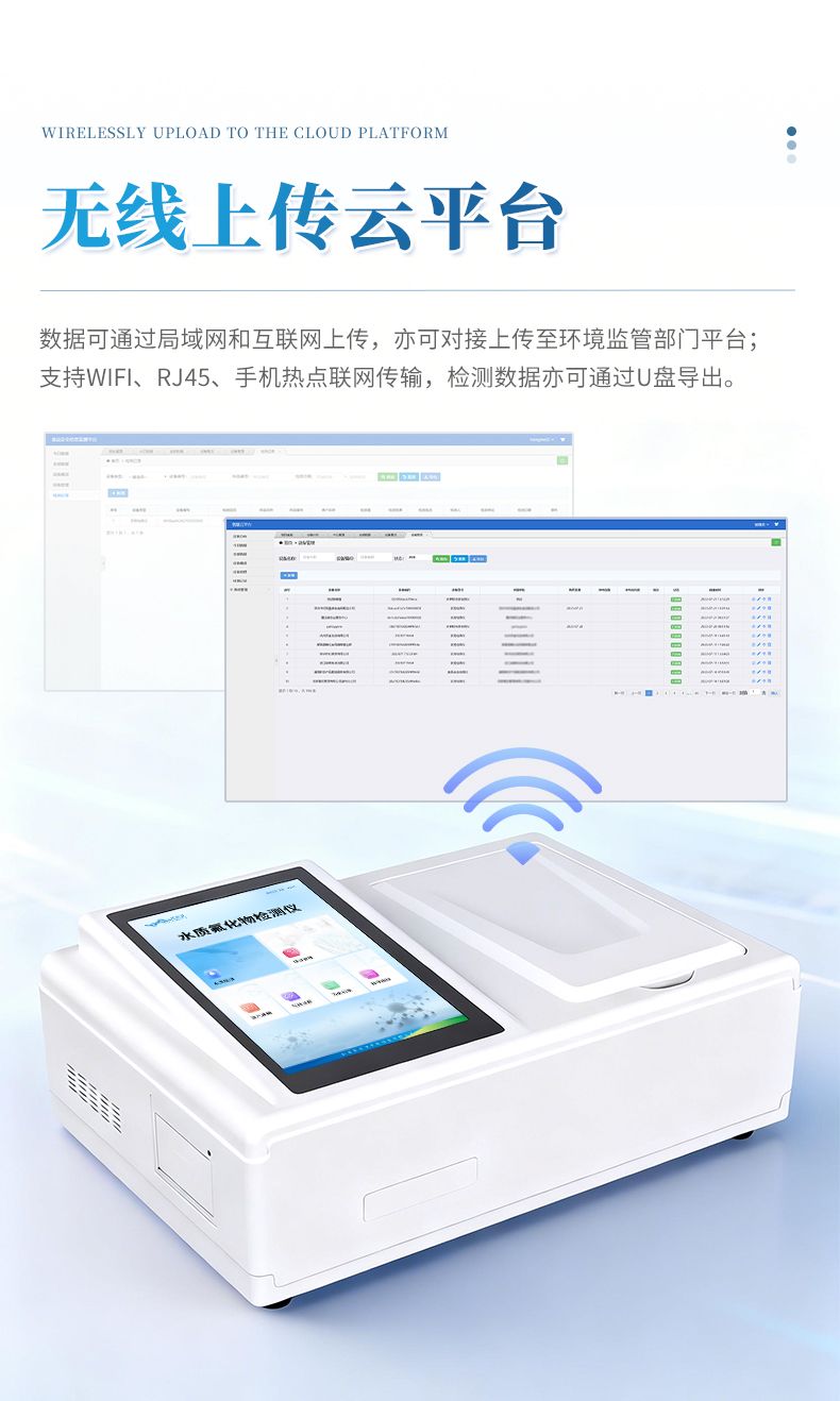2.配置云監(jiān)控平臺,檢測結(jié)果可直接無線傳至平臺,進行水質(zhì)長短期分析,輔助管理;