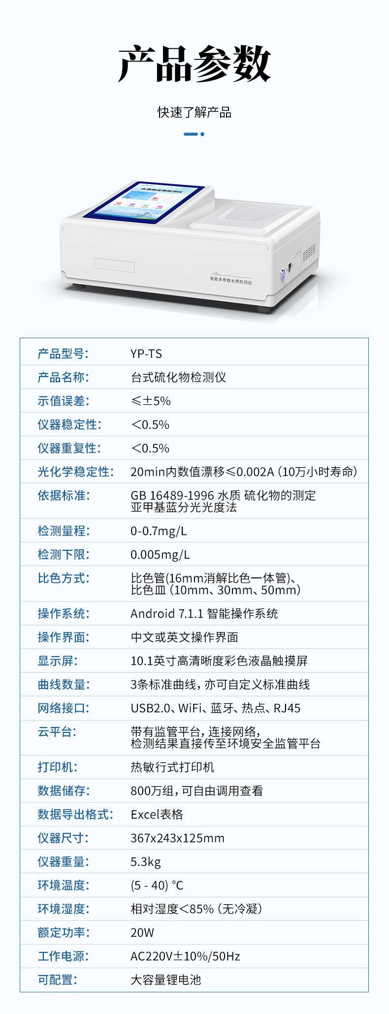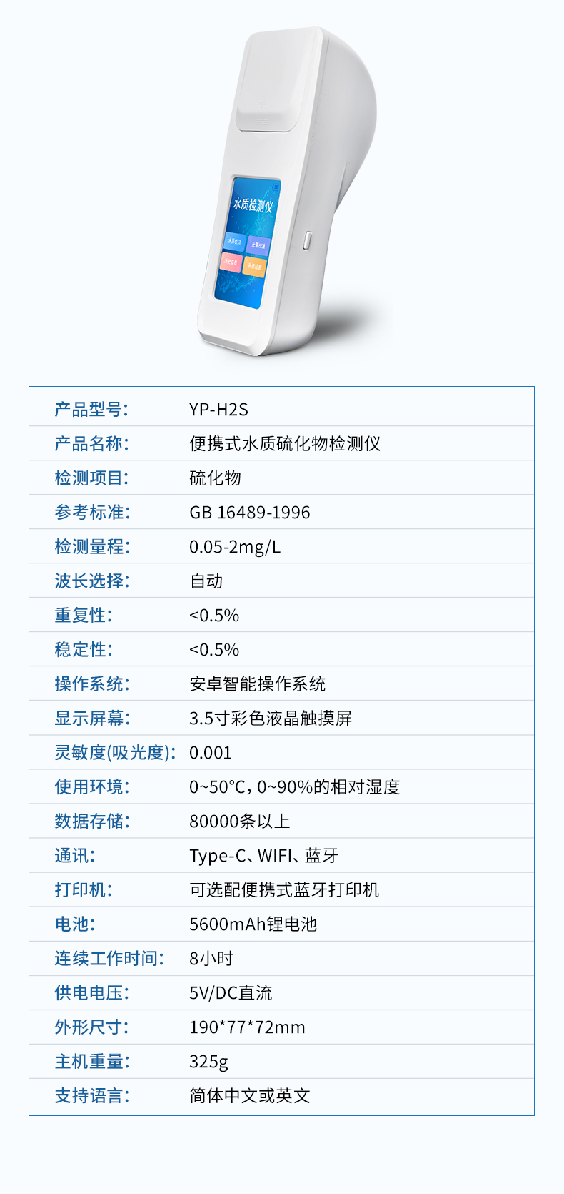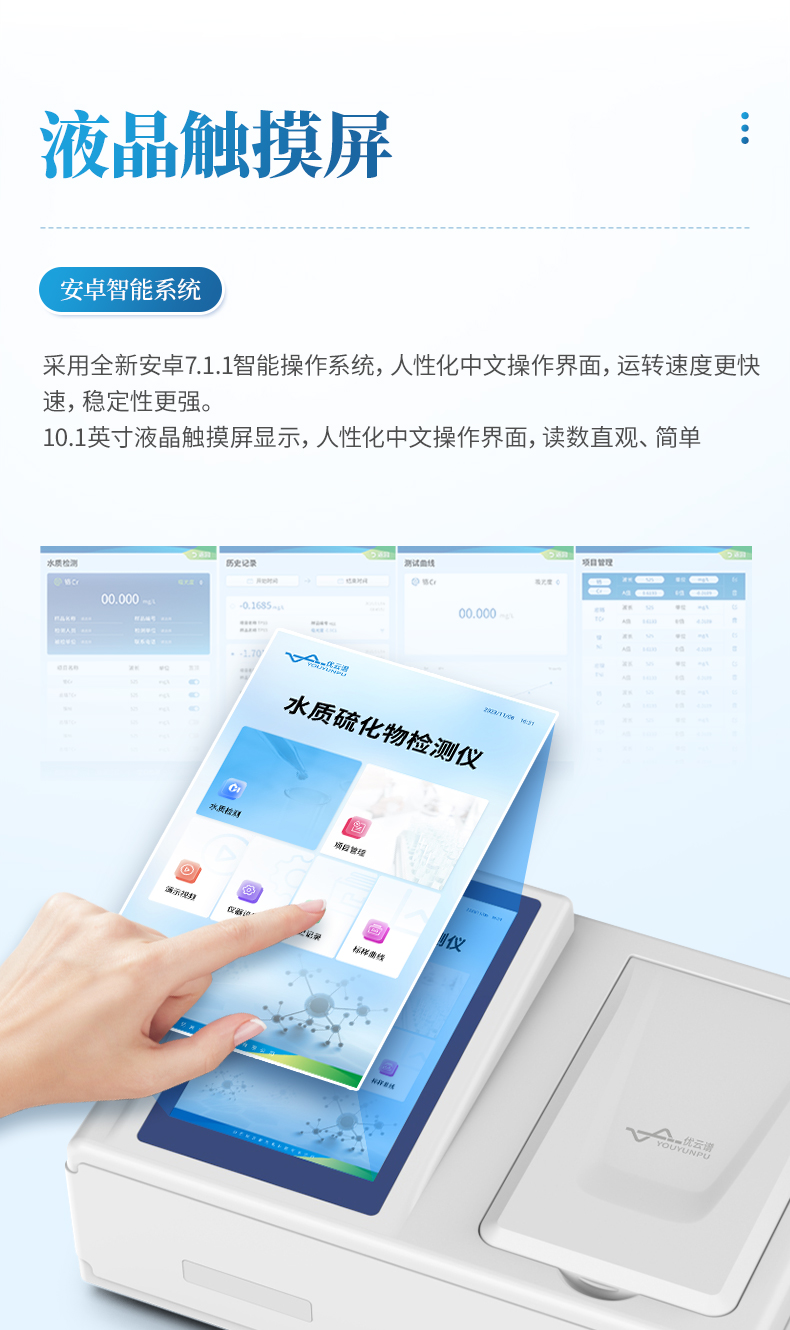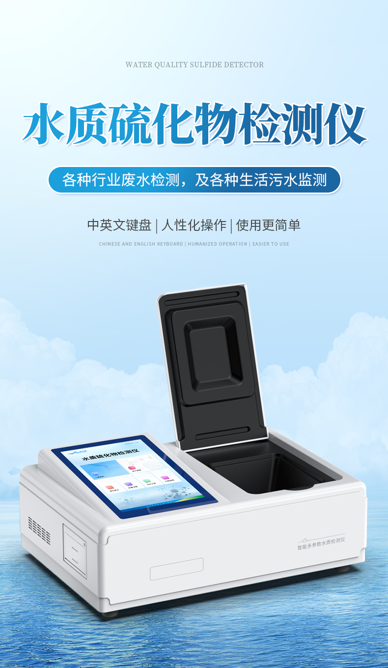 水質硫化物檢測儀是依據《GB 16489-1996 水質 硫化物的測定 亞甲基藍分光光度法》設計制造,主要檢測水質中硫化物的含量;本儀器兼具智能數據分析功能,圖表、列表顯示數據,分析一目了然;高清晰度彩色液晶觸摸顯示屏,Android智能操作系統,中文顯示界面,中英文鍵盤,人性化操作,使用更簡單。