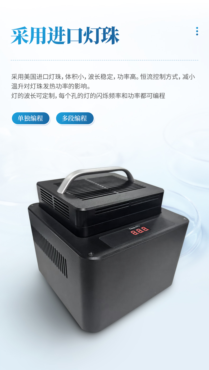 燈的波長(zhǎng)可定制,每個(gè)孔的燈的閃爍頻率和功率都可單獨(dú)編程,并且支持多段編程。