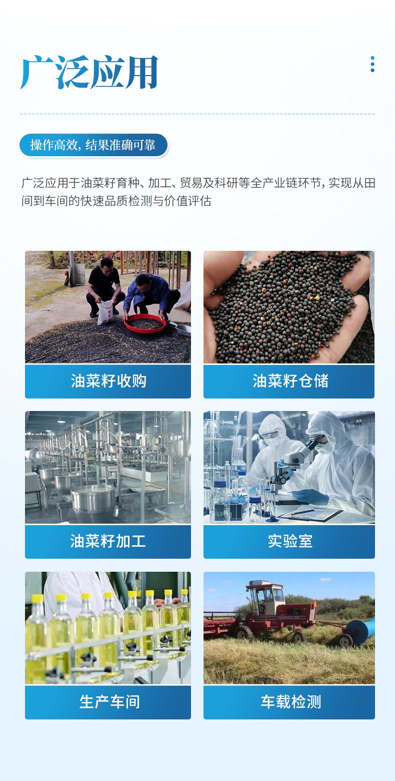 本儀器廣泛應(yīng)用于油菜籽產(chǎn)業(yè)鏈的各個(gè)環(huán)節(jié),為品質(zhì)管控與價(jià)值評(píng)估提供高效解決方案。在育種端,可快速篩選優(yōu)質(zhì)種質(zhì)資源;在加工端,服務(wù)于油脂、食品及飼料企業(yè)的原料驗(yàn)收與生產(chǎn)過(guò)程控制環(huán)節(jié);在貿(mào)易端,為現(xiàn)貨收購(gòu)、期貨交割實(shí)現(xiàn)現(xiàn)場(chǎng)快速定價(jià)與品質(zhì)鑒定。同時(shí),是科研及檢測(cè)機(jī)構(gòu)進(jìn)行成分分析與科學(xué)研究的得力工具,全面覆蓋從田間到車間的精準(zhǔn)檢測(cè)需求。