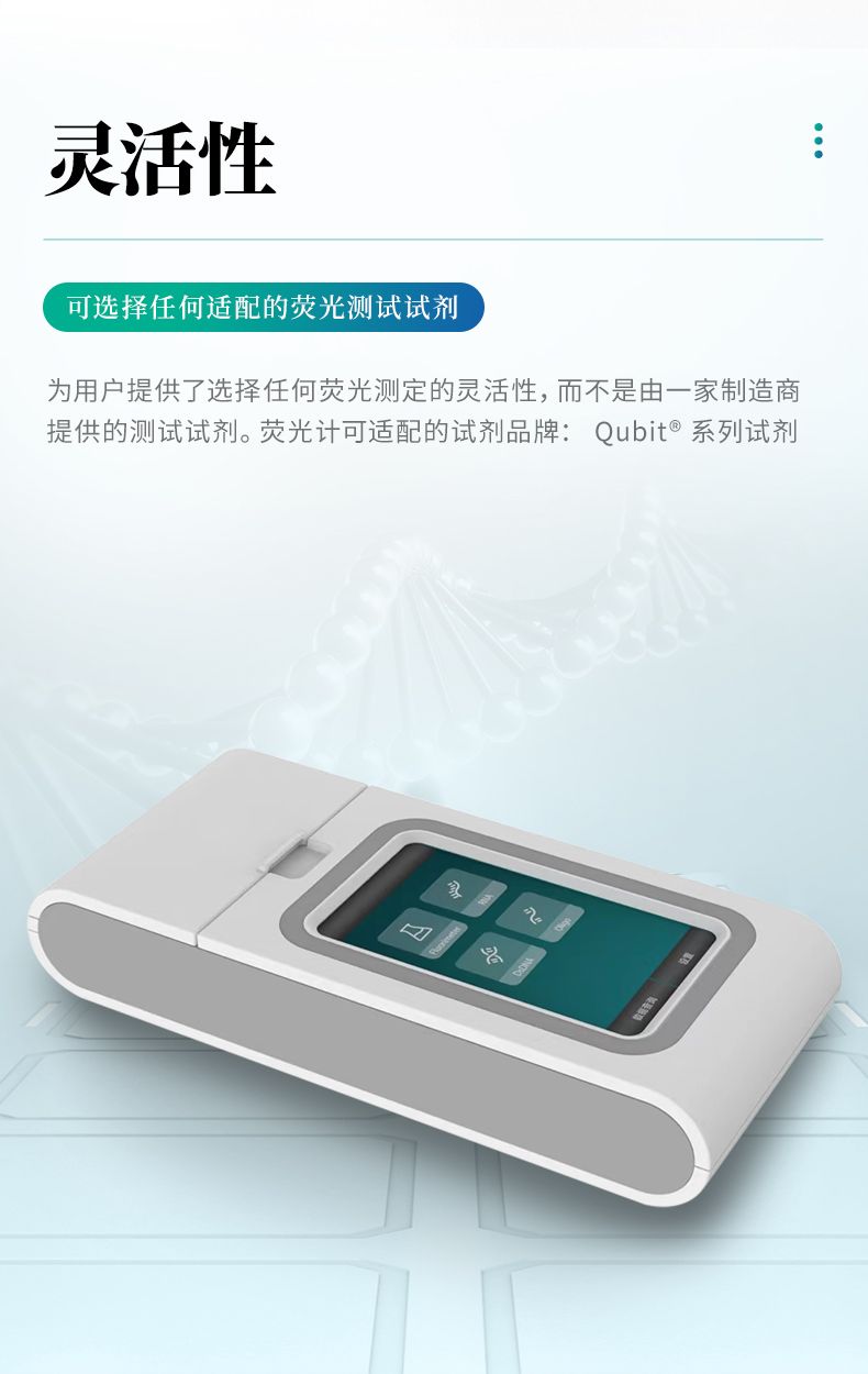 靈活性---為用戶提供了選擇任何熒光測(cè)定的靈活性,而不是由一家制造商提供的測(cè)試試劑。熒光計(jì)可適配的試劑品牌:Qubit?系列試劑.