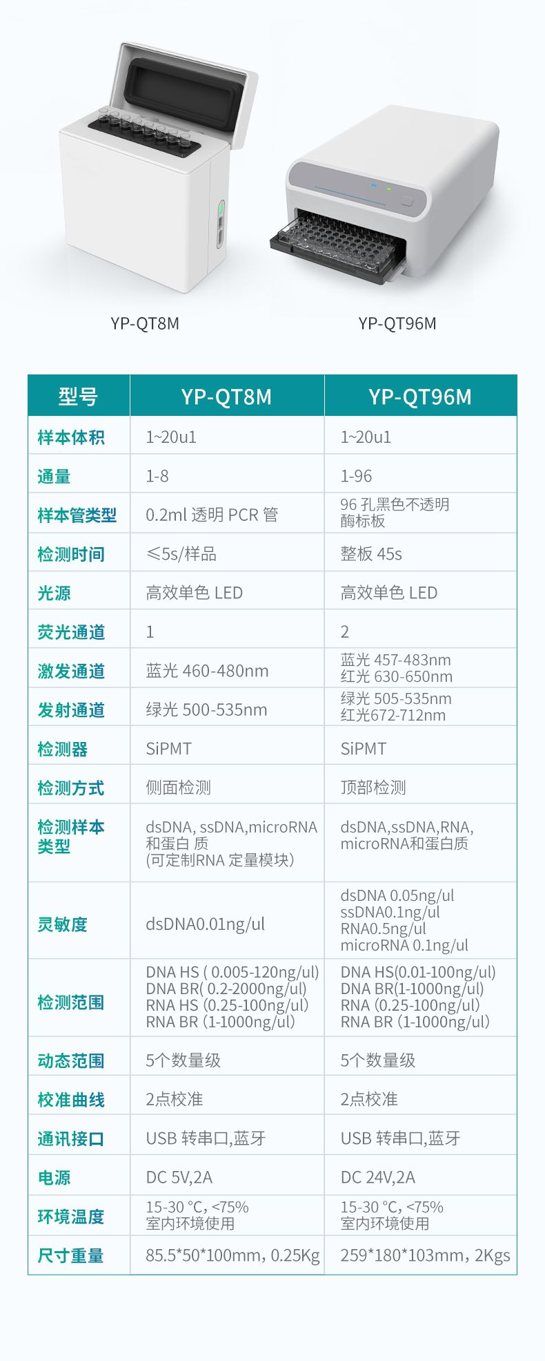 檢測(cè)項(xiàng)目 | dsDNA High Sensitivity dsDNA Broad Range RNA High Sensitivity RNA Broad Range RNA Extended Range microRNA ssDNA Protein Broad Range | dsDNA High Sensitivity dsDNA Broad Range ssDNA microRNA Protein Broad Range |