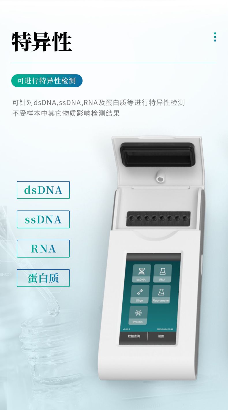 特異性---可針對(duì)dsDNA,ssDNA,RNA及蛋白質(zhì)等進(jìn)行特異性檢測(cè),不受樣本中其它物質(zhì)影響檢測(cè)結(jié)果