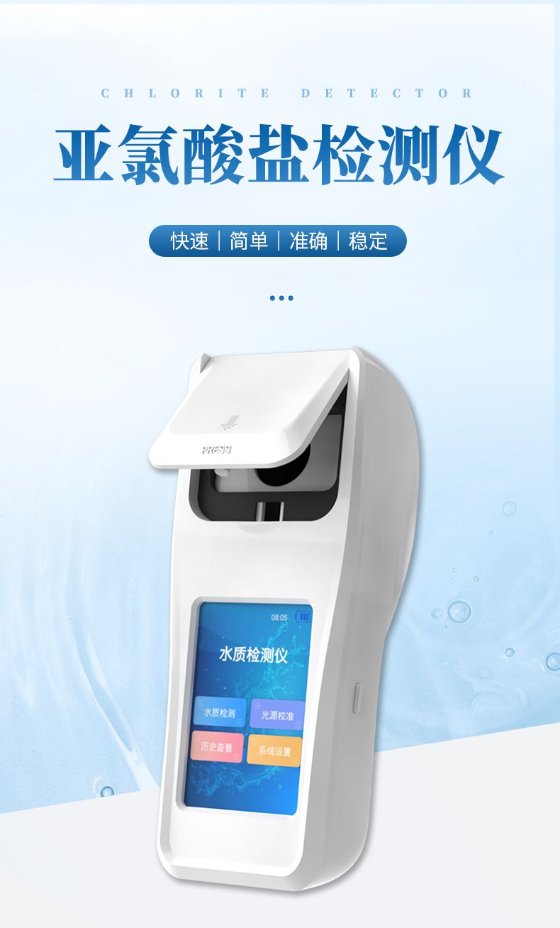 亞氯酸鹽是投放二氧化氯消毒劑后的副產(chǎn)物,超標對人有致癌作用。便攜式亞氯酸鹽檢測儀器配合快速顯色檢測試劑,可“快速、簡單、準確、穩(wěn)定”進行測量,擁有精美的外觀造型,簡單的操作界面,準確的檢測系統(tǒng),幫助用戶獲得精細的數(shù)據(jù),可更準確、有效的分析水體狀況。
