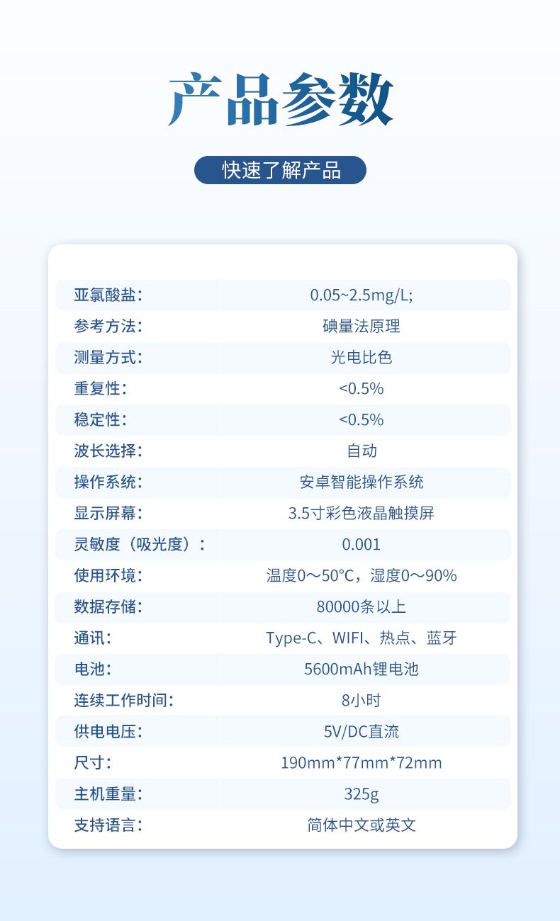 【產(chǎn)品簡介】亞氯酸鹽:0.05~2.5mg/L