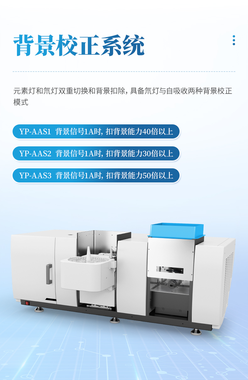 具備氘燈與自吸收兩種背景校正模式,背景信號(hào) 1A 時(shí),扣背景能力 40 倍以上。