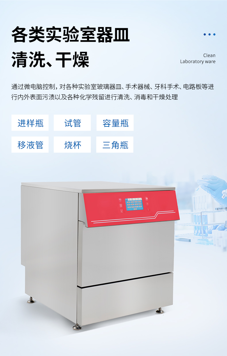 實驗室洗瓶機又叫全自動器皿清洗機,可用于清洗實驗室玻璃器皿、手術器械、牙科手術、電路板等內外表面污漬以及各種化學殘留、消毒和干燥處理。使用玻璃器皿清洗機可以防止有毒物質或破損器皿對工作人員的感染和傷害,降低工作危險,同時也大大的提高了工作效率。