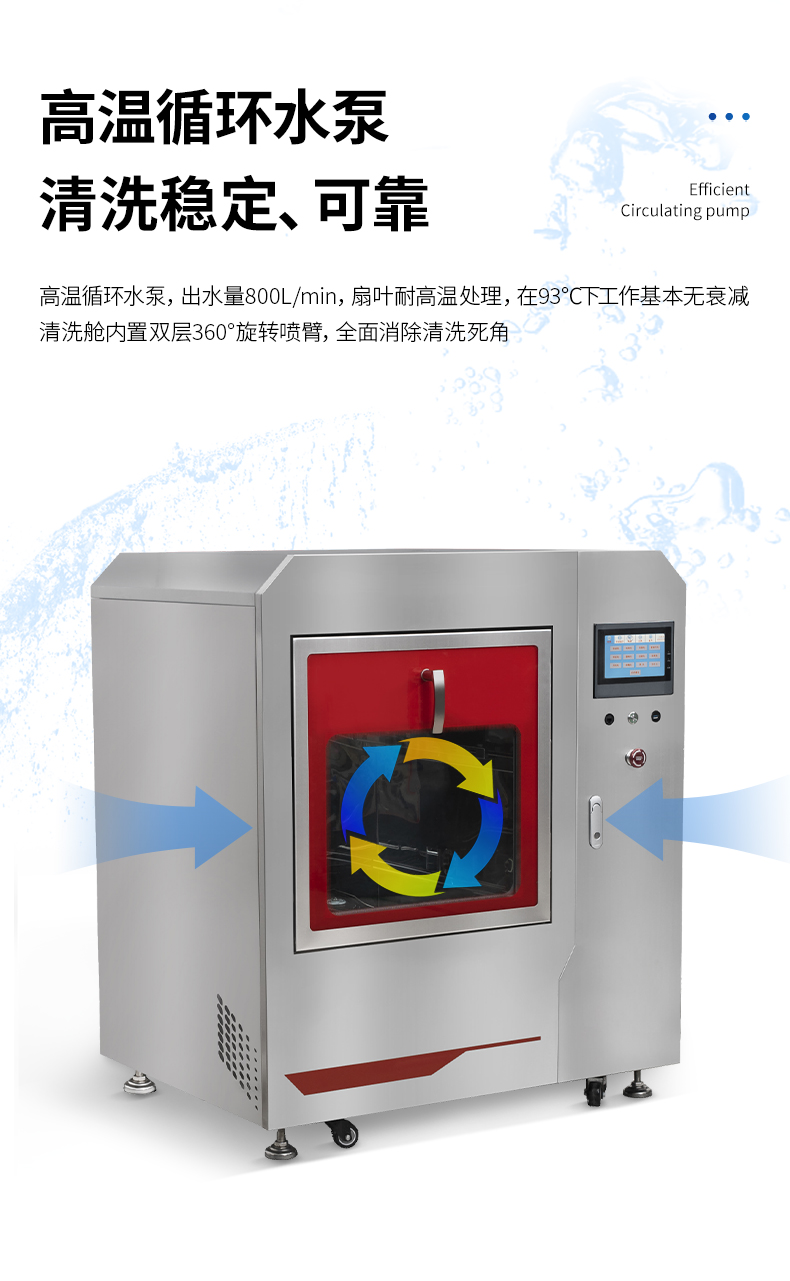 *4.1 清洗水泵為專業歐洲原裝循環泵,出水量430L/min,出水量大,沖刷力大。循環泵扇葉做了耐高溫處理,可以在消毒水溫下(93℃以上)正常工作。